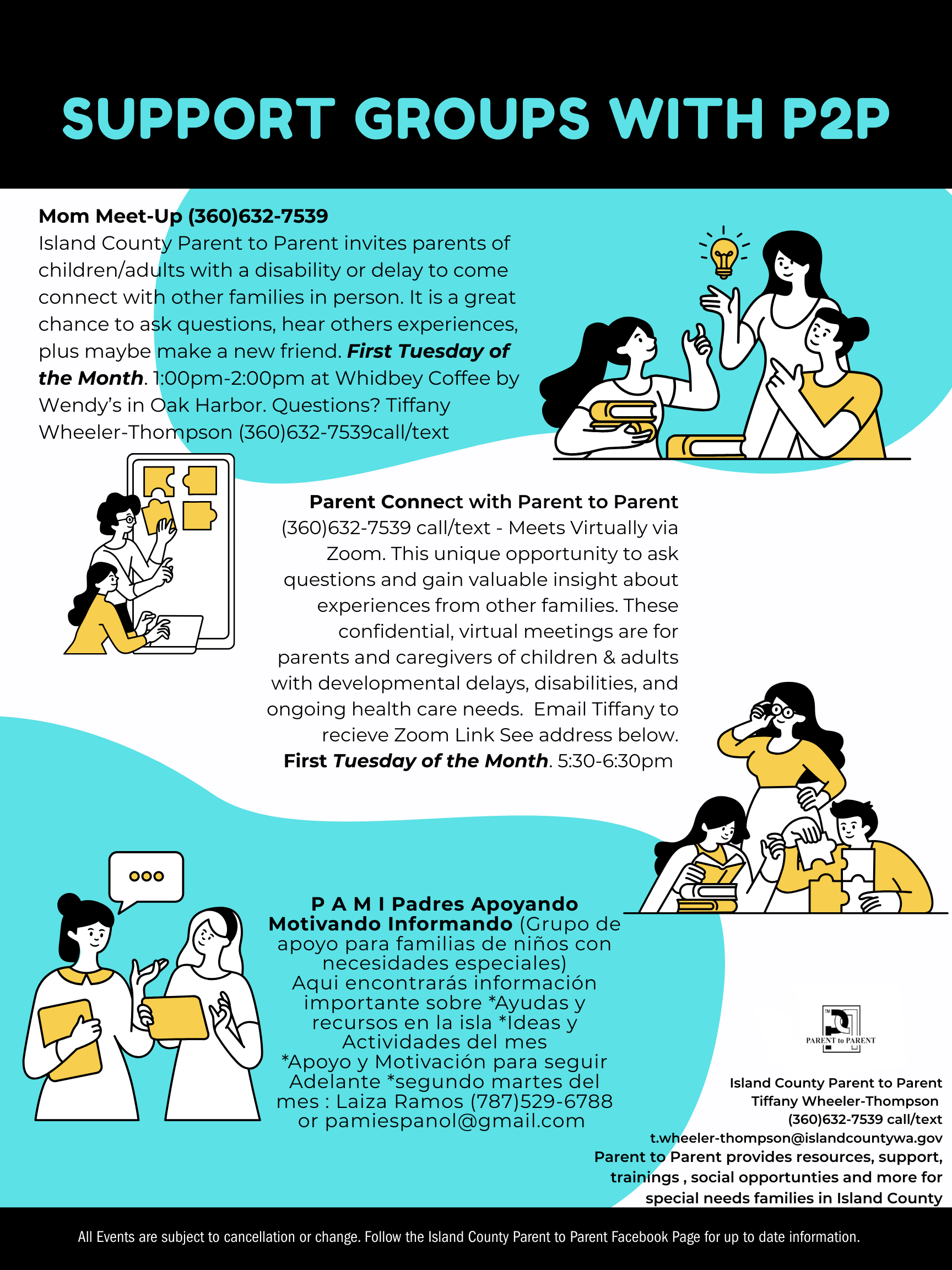 Island County Support and Social Groups for families and adults with disabilities. Support & Social Groups 2026 Don't forget, Mom Meet-up in person or Parent Connect Meetings are virtual meet the First Tuesday of the Month. Support Groups with P2P 2026
